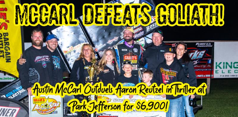 JEFFERSON, S.D. (May 30, 2020) - Unarguably one of the the most exciting main event outcomes in Ollie’s Bargain Outlet All Star Circuit of Champions presented by Mobil 1 and Bumper-to-Bumper IRA Series history, Altoona, Iowa’s Austin McCarl accomplished the near-impossible on Saturday night at Park Jefferson International Speedway in Jefferson, South Dakota, and held off two-time and defending All Star champion, Aaron Reutzel, for a first-ever Series victory and a $6,900 top prize. Originally slated to award $6,600, Kevin Rudeen of Rudeen Racing bumped the winner’s share an extra $300 to award $6,900.